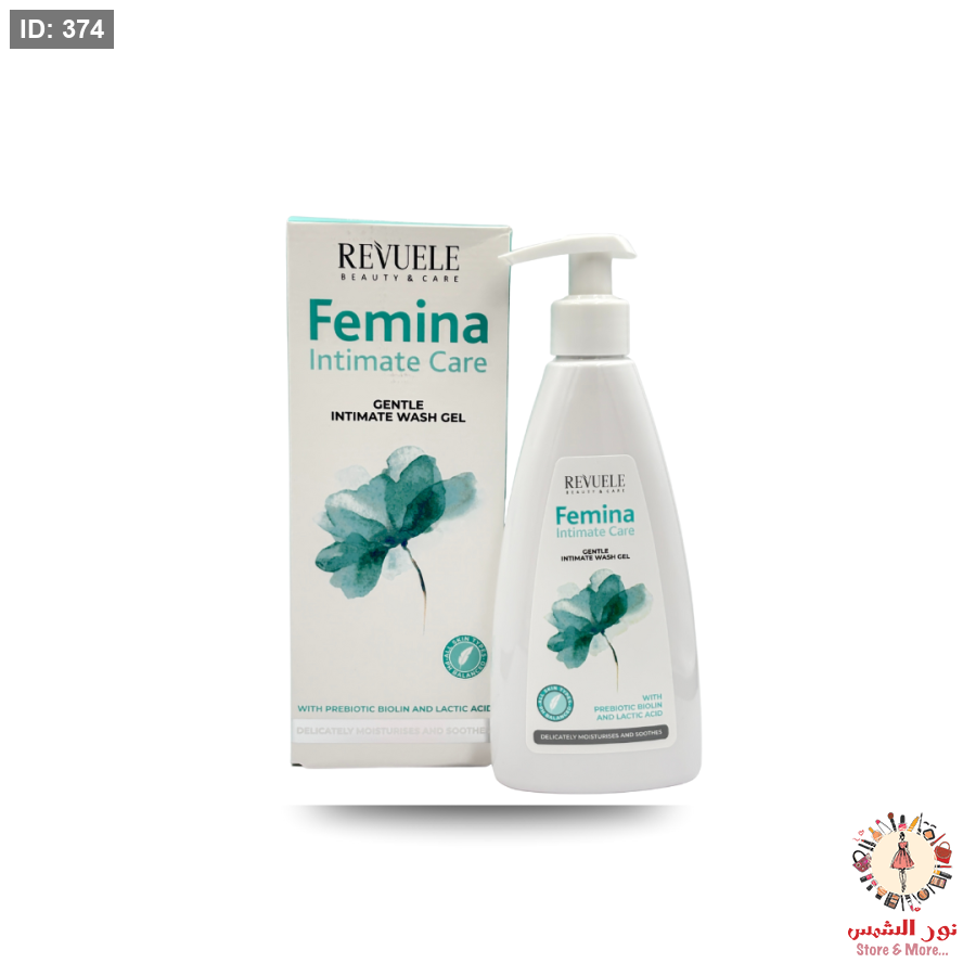 غسول Revuele Femina Gentle Intimate Wash Gel مصمم خصيصًا للعناية اليومية بالمناطق الحساسة بتركيبة لطيفة تجمع بين البيولين البروبيوتيك وحمض اللاكتيك.