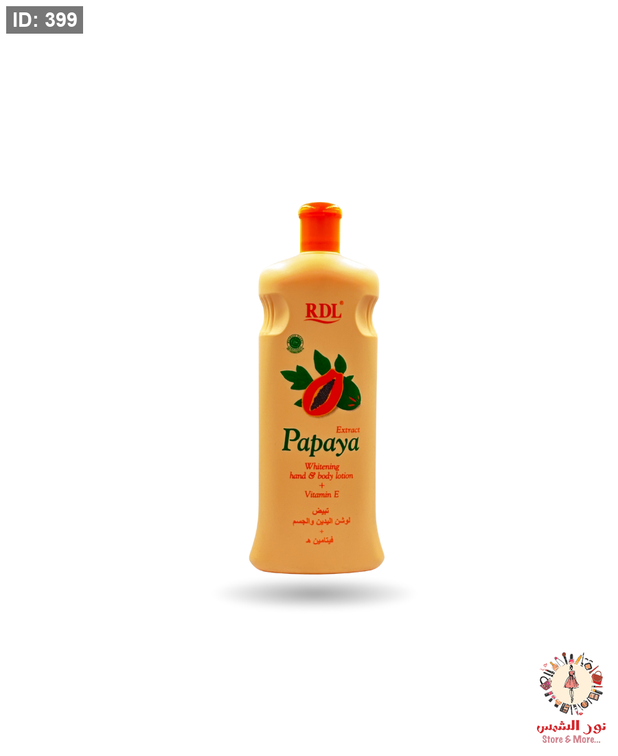 دلّلي بشرتك بعناية يومية فعّالة مع RDL Papaya Whitening Lotion الغني بخلاصة البابايا الطبيعية وفيتامين E.