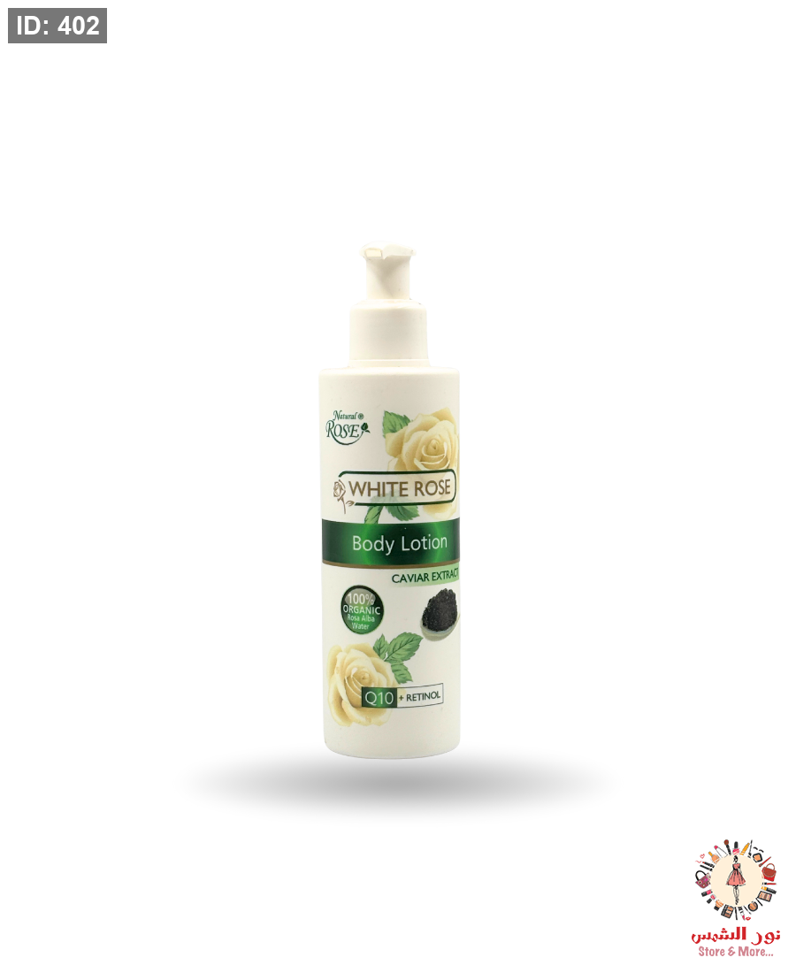 امنحي بشرتك تجربة فاخرة من الترطيب والتغذية مع White Rose Body Lotion الغني بخلاصة الكافيار وQ10 والريتينول وماء الورد الأبيض العضوي 100%.